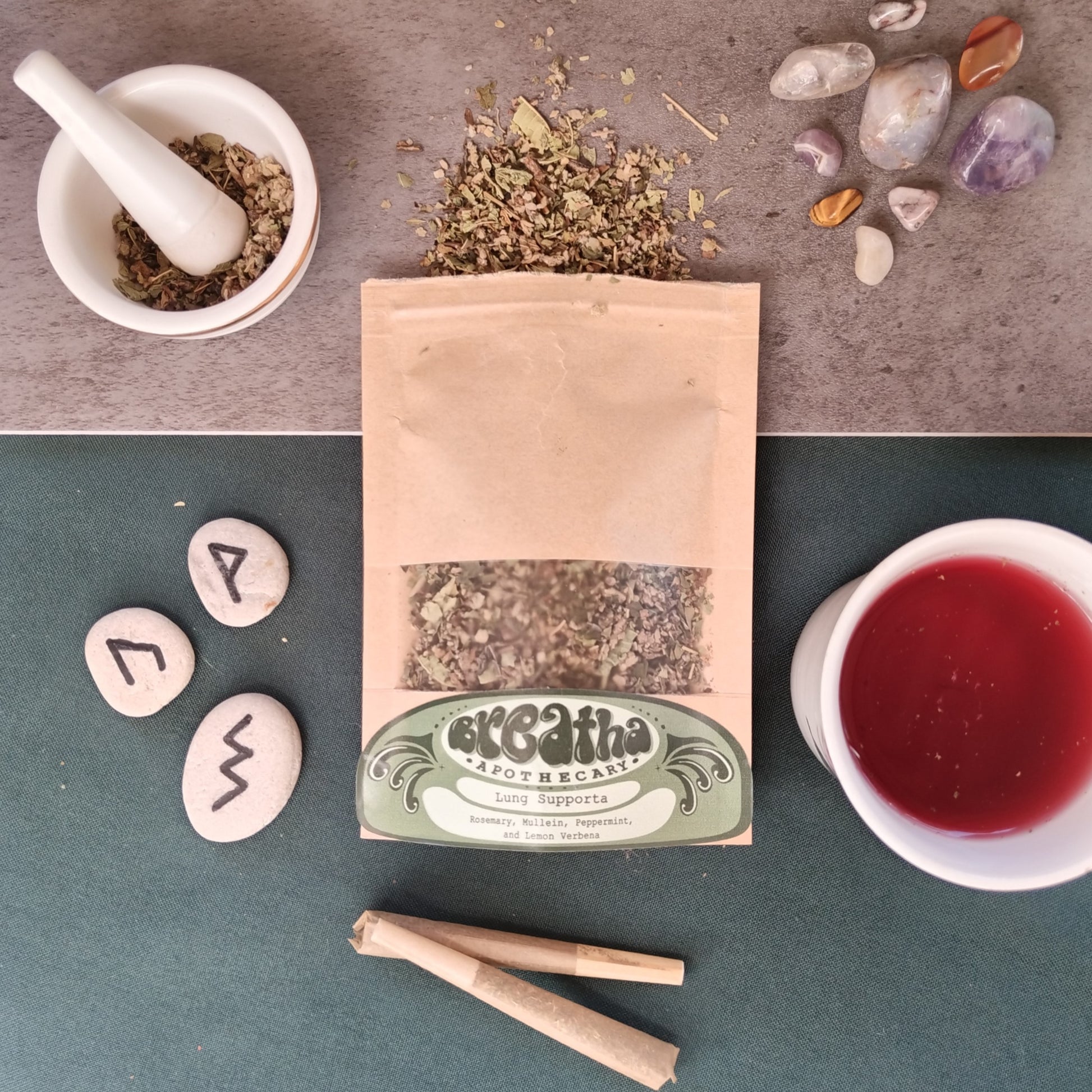 Breathe easier and elevate your cannabis experience with Lung Supporta, a carefully crafted herbal smoke blend designed to support respiratory health and help expel mucus. This synergistic blend of Rosemary, Mullein, Peppermint, and Lemon Verbena works harmoniously to provide a smoother, more comfortable inhale while promoting overall lung health.